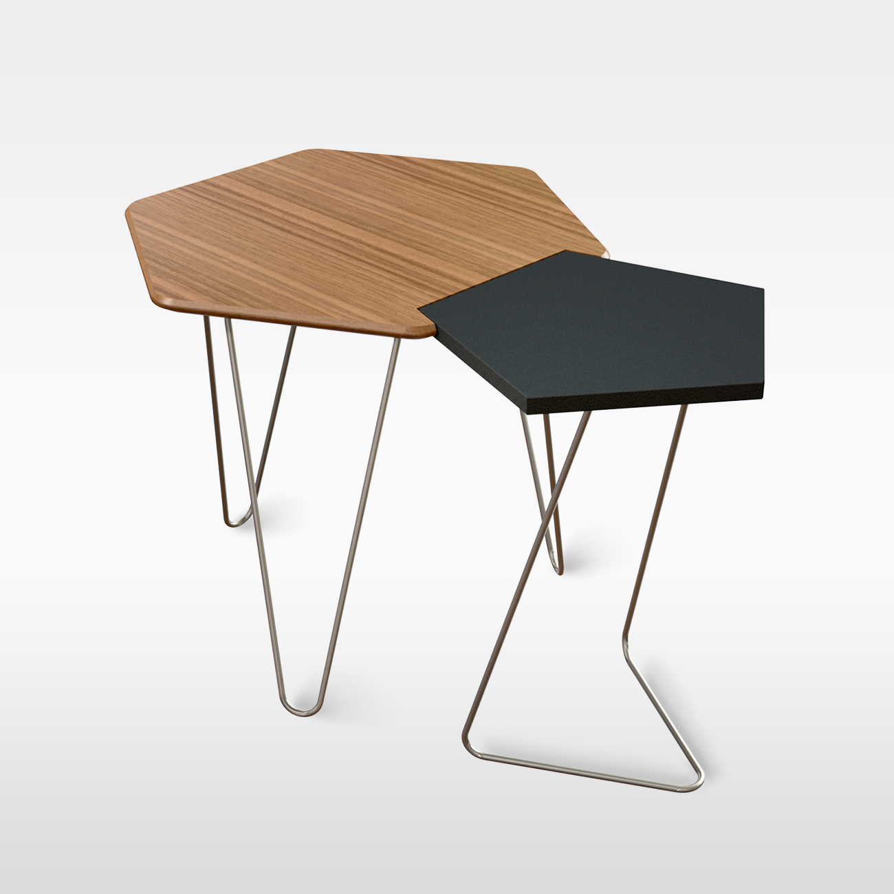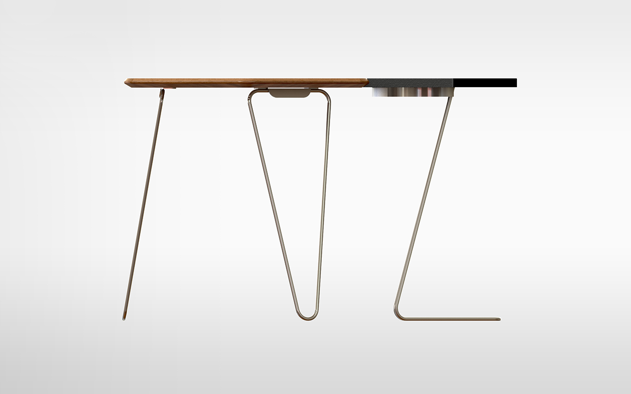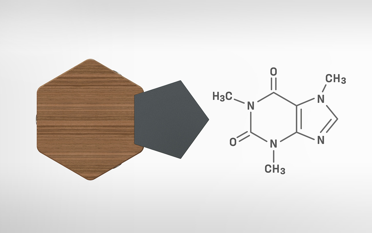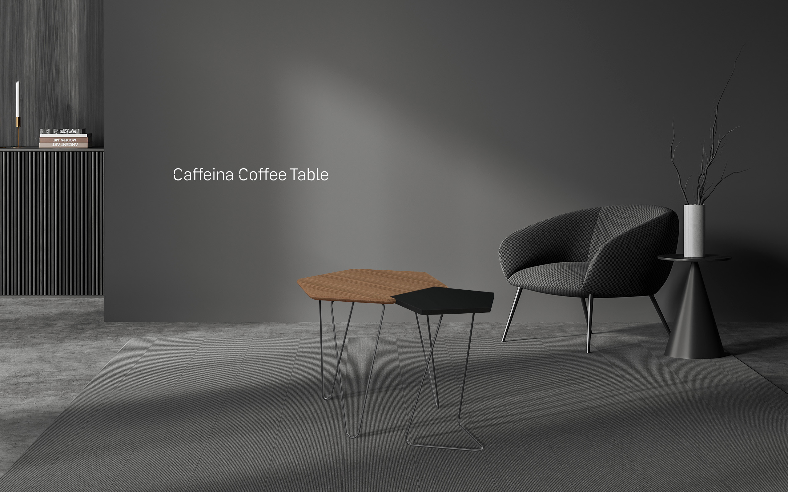 When the molecule of caffeine hits your nervous system, your blood flow and heart rate speed up, and you can make faster connections in your brain and be more productive. The Caffeina coffee table concept has been developed with this in mind; its modularity allows you to use a different arrangement and total surface area, depending on its use for each specific task. Additionally, the act of connecting the two modules becomes an anchor-movement: it programs your brain (releasing other chemicals such as dopamine, serotonin, oxytocin and endorphins) to get ready for the task you’re about to accomplish. All materials and finishes have been carefully selected to enhance the experience of ‘connection’. The silky and warm finish of the wood is juxtaposed with textured powder-coated metal, once they’re connected they create something powerful. In the same way that caffeine molecules connect to your nervous system.