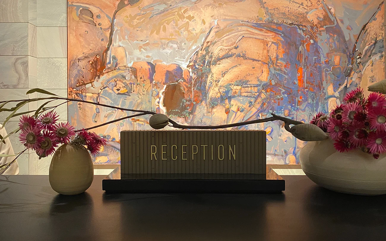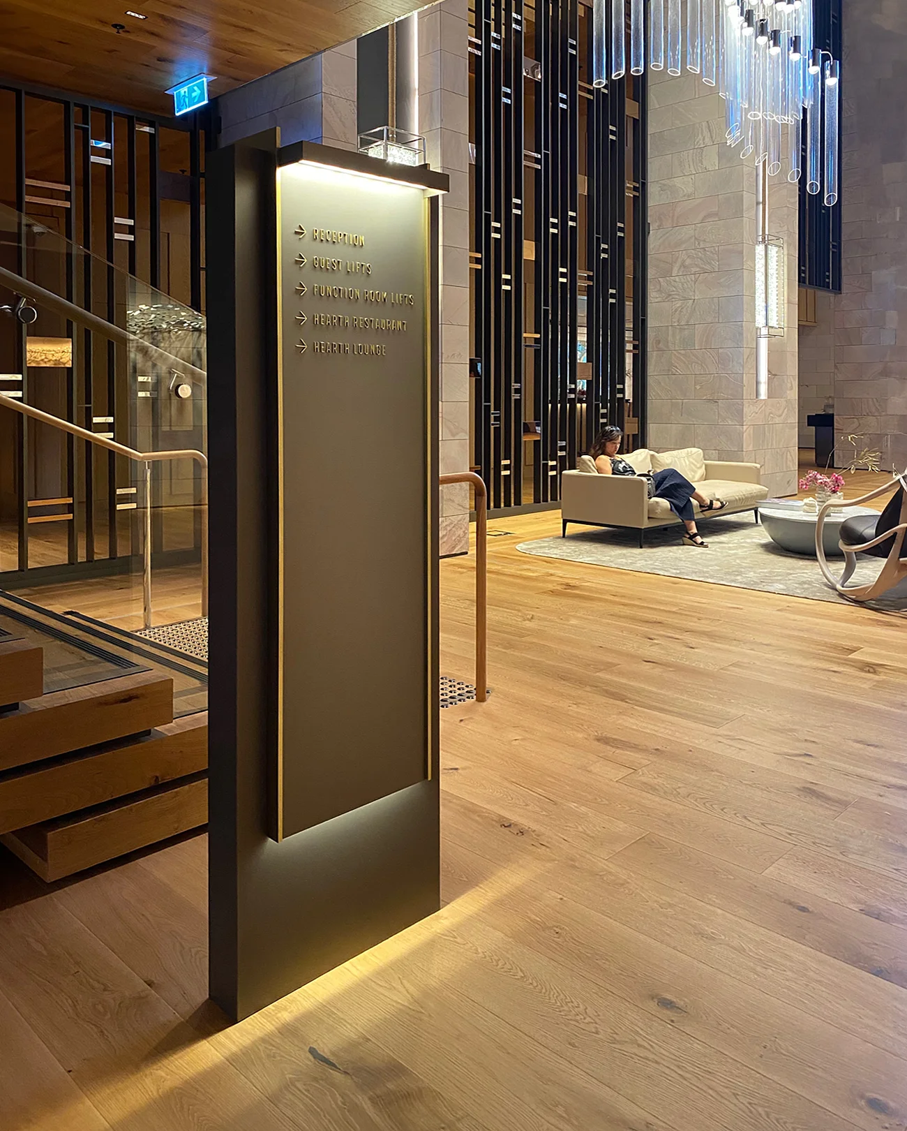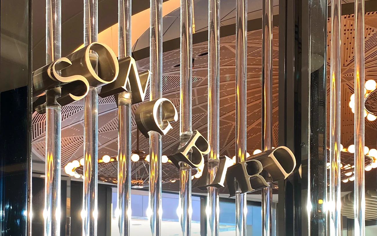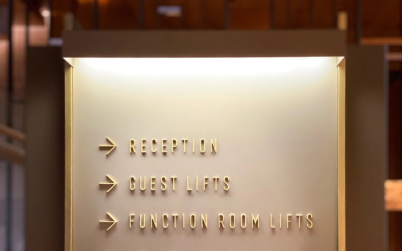 The internal wayfinding signage for the hotel was designed to harmonise with the interior themes resulting in a combination of engraved textural dark bronze plaques accentuated with brass elements and lettering. The scope of work also included speciality signage for the 'Hearth' restaurant, 'Songbird' bar and 'The Towers' apartments.